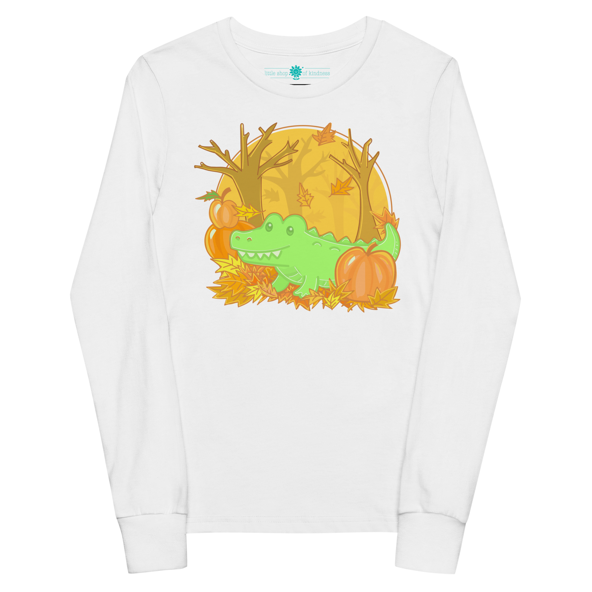 The swamp is alive with autumn colors, and our playful Alligator is right in the middle of it all. Surrounded by crunchy leaves and smiling pumpkins, this friendly gator shows that fall is for fun, cozy days, and a little bit of swamp magic. Whether your kiddo is heading to the pumpkin patch, raking leaves, or just enjoying the season, this long sleeve makes every moment feel festive and bright.