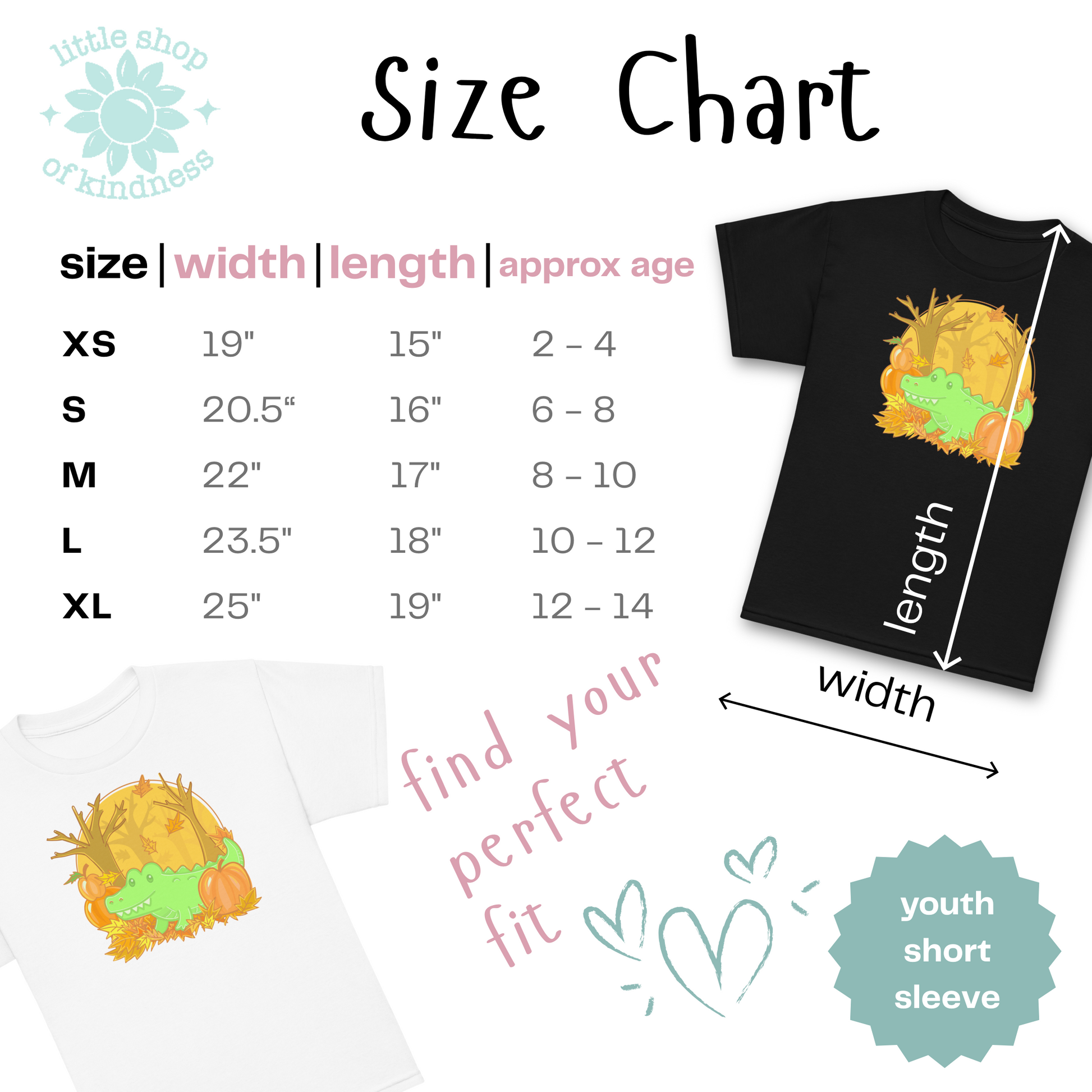 Our playful alligator is ready for autumn adventures! Surrounded by pumpkins and colorful falling leaves, he shows that even swamp friends love the cozy magic of fall. This tee is perfect for crisp school mornings, leaf pile jumping, and every pumpkin patch visit in between.