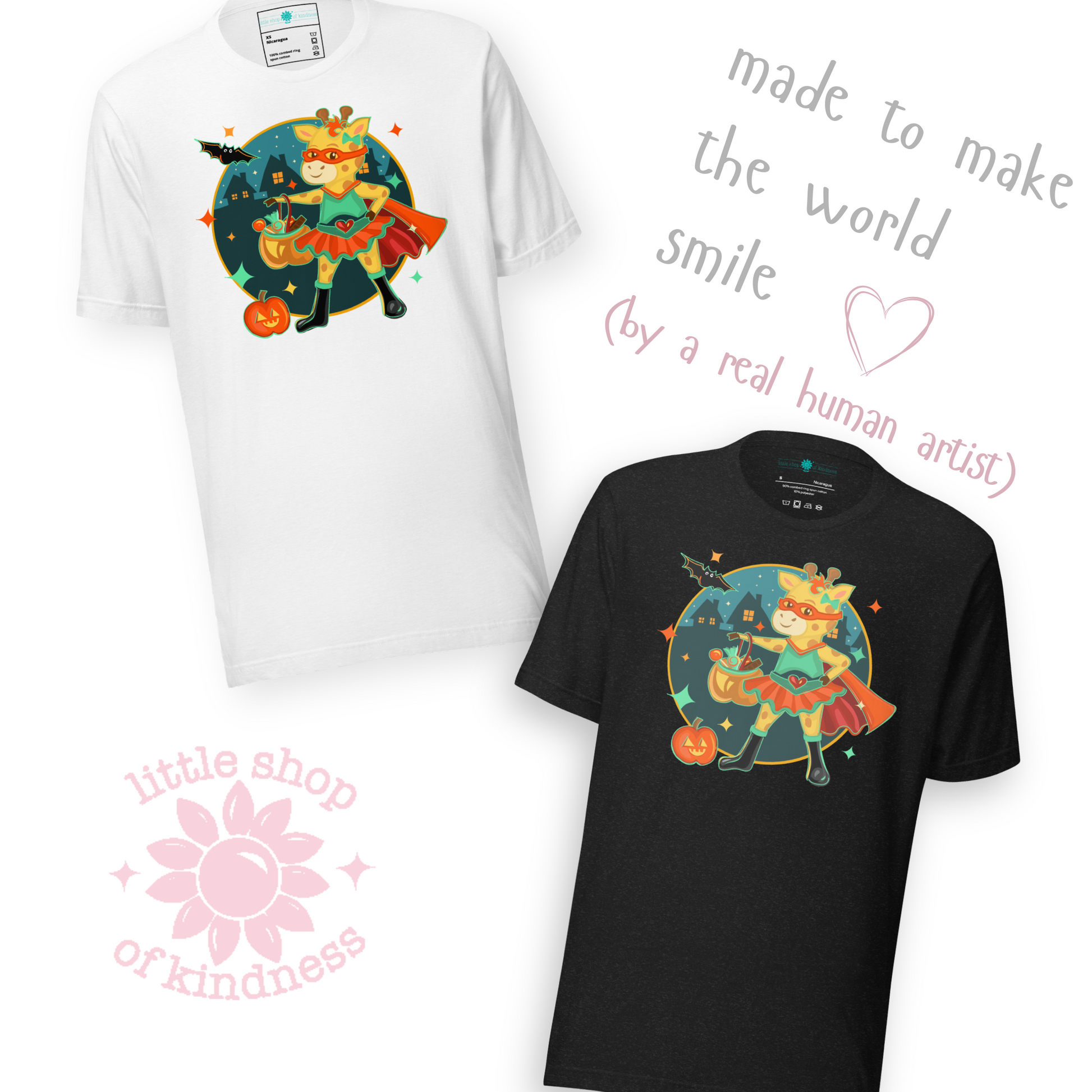Step into spooky season with Sophie the giraffe! Dressed as a Halloween superhero, Sophie carries pumpkins, bats, and plenty of festive cheer. This tee isn’t just for kids—it’s a playful, quirky piece for grown-ups too. Whether you’re trick-or-treating with your little ones, matching in a family photo, or just love celebrating Halloween in style, Sophie brings joy to every autumn night.