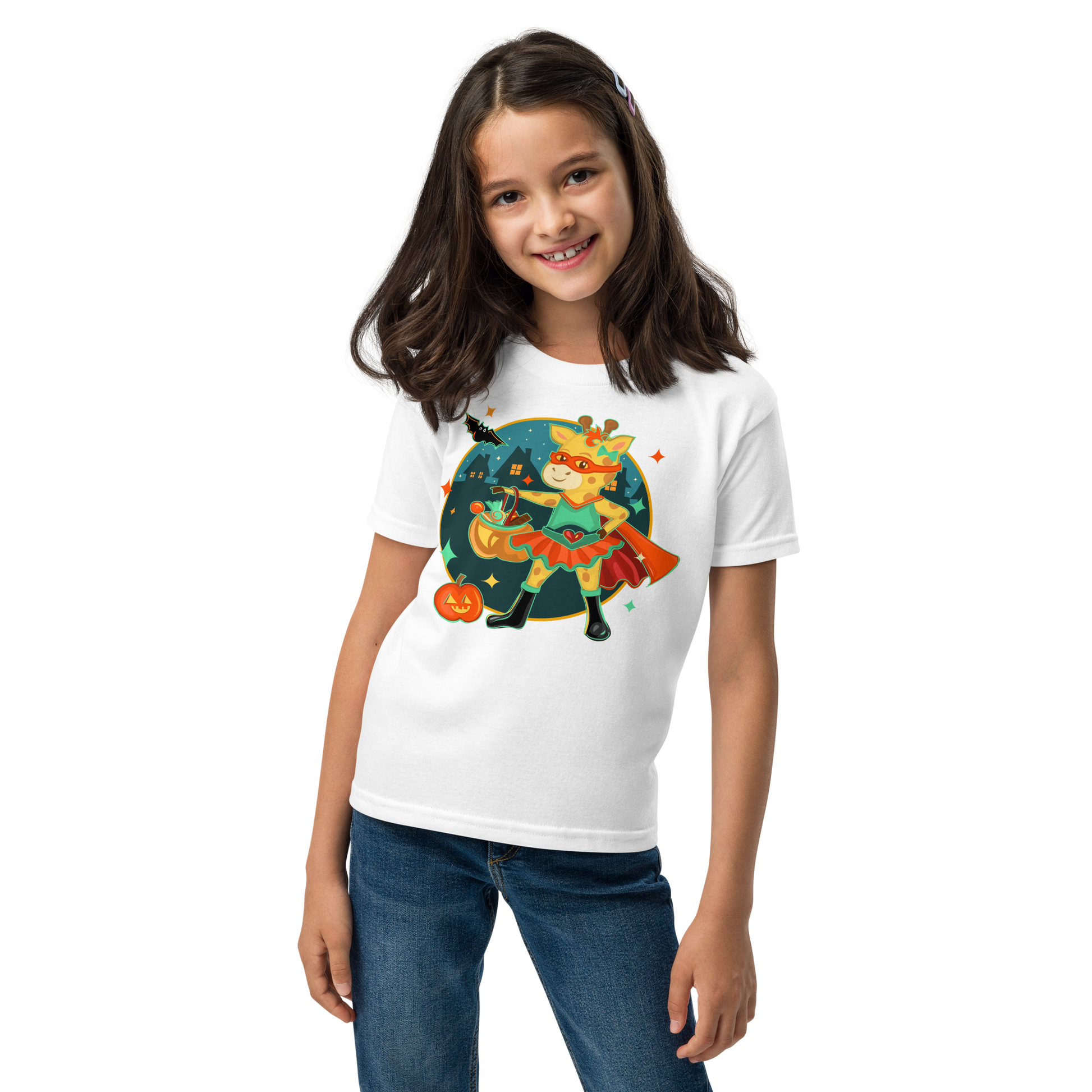 Sophie the giraffe loves Halloween! Dressed up and ready for tricks, treats, and pumpkin patch fun, she brings a touch of spooky magic wherever she goes. With her playful spirit and quirky style, this tee makes the perfect outfit for classroom parties, trick-or-treating, or just celebrating the season of pumpkins and giggles.